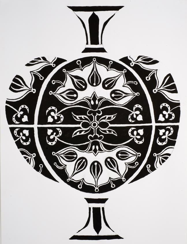 Elisabeth Kley, Large Black and White Three Part Bottle Study with Fans, 2012, ink and graphite on paper, 46 x 35 inches.