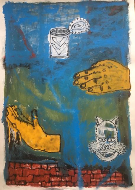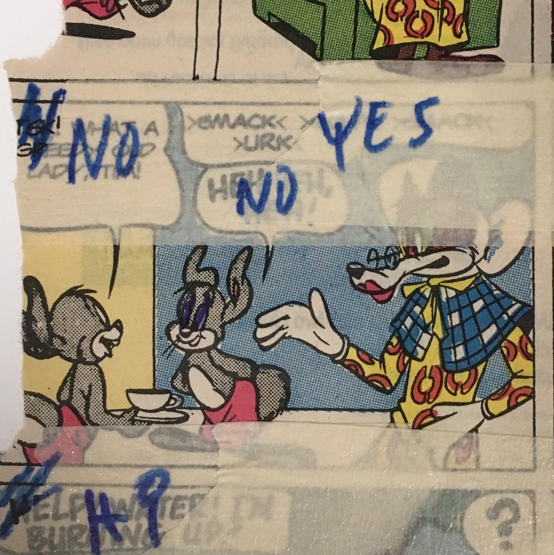 The paintings by New Hampshire artist Andy Heck Boyd are motivated in part by his paranoid schizophrenia and delusions of hearing the voices of Satan. These burdens have led Andy to multiple college drop outs, and forced him to become self-taught. These starts at an art education places his work between that of pure Outsider artist and seasoned grad. Pulling from numerous aesthetics and styles, his work ranges from short novellas, comics, film, photography and painting and addresses concerns about identity, memory and humor. In this series of altered comic book pages, characters have been given new conversations that demand, ignore, and ultimately accomplish nothing.