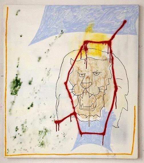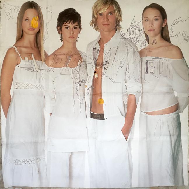acrylic and marker on vinyl with embellishments, 76 x 76 inches.