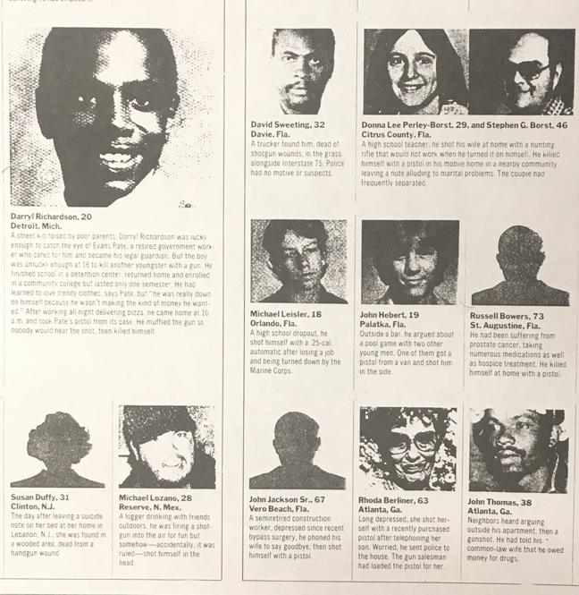 Félix González-Torres, (1957 Guáimaro, Cuba-1996 Miami, Florida). Inspired by an article published by TIME magazine in July 17, 1989, González-Torres explored the relationship America has with guns with this piece “Untitled” (Death by Gun) 1990, and pays homage to the 460-people killed in America by gunshot for the week of May 1–7, 1989. He makes us reflect on the grim reality of the gun violence in America, presenting a sobering view of the many lives lost. Originally, this piece is composed of a nine inch high stack of lithographs with the picture of the deceased with the description of the individuals, their age, city and state where they lived, followed by a brief description of the cause of death. Viewers are allowed to remove a sheet for themselves and the exhibiting venue updates the stack to the original nine inches. This print was acquired from an exhibition at The Museum of Modern Art, New York City, 1996. The most pervasive reading of González-Torres’s work takes the processes his works undergo (lightbulbs expiring, piles of candies dispersing, etc.) as metaphor for the process of dying. However, many have seen the works also representing the continuation of life with the possibility of regeneration (replacing bulbs, replenishing stacks or candies).