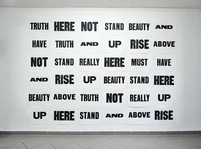 Ben Coode-Adams and Justin Knopp (Essex and London) have collaborated to produce PROOF. a large multi-paneled letterpress print that is fluid and rearrangeable according to whim. The artists worked together to collect the most popular words from protest signage from a London rally. With each word printed boldly on a single card, various arrangements can happen, each calling the viewer to action but for no specific cause. Ben has a busy drawing and sculpture practice with extensive exhibitions in Europe. Justin operates Typoretum, an extensive letterpress shop using a variety of traditional types including a fully restored 1857 Columbian Press.