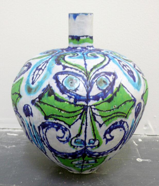 Elisabeth Kley, Lime and Blue Moustache Wing Bottle, 2008, glazed earthenware, 11 inches high