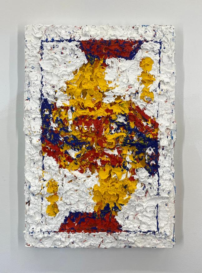 Knave 1, 2021, oil, alkyd, acrylic, and cold wax on panel, 18 x 12 inches.