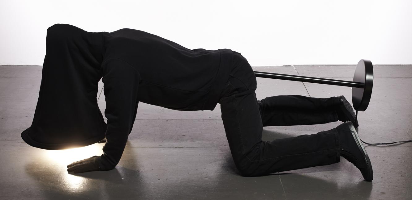 Mike Simi, Lamp, 2016, mixed media with street clothing, electronics, 24 x 24 x 60 inches.