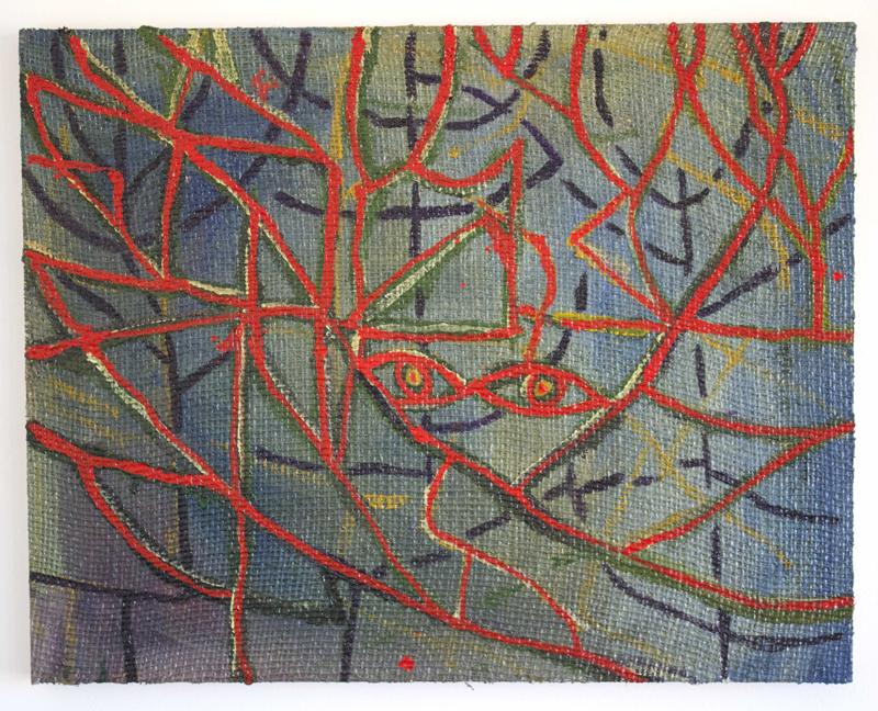 Peter Scherrer, Sticks, Eyes, 2014, oil on burlap on panel, 16 x 20 inches.