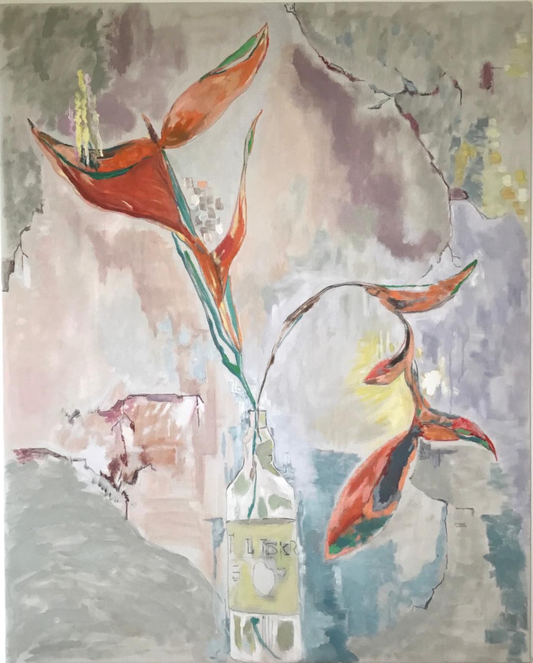 Heliconia, 2020, acrylic on curtain mesh material, 60 x 48 inches.